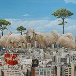 Artist Shuichi Nakano’s “Searching for Paradise” paintings depict Godzilla-sized animals towering over the urban sprawl of Japan.